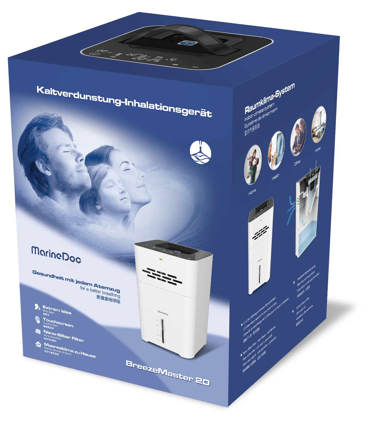 Der BreezeMaster 20 ist ein nach dem Kaltverdunstungsprinzip entwickeltes Inhalationsgerät,was ein angenehmes und wohltuendes Raumklima in Ihrem Zuhause oder Ihrem Büro schafft. Die Inhaltsstoffe der dazugehörige MarinPura Solelösung werden gleichmäßig im Raum verteilt und schaffen so ein salzhaltiges und meeresähnliches Raumklima. Die Inhalation erfolgt über die natürliche Atmung – ganz ohne Zeitaufwand oder zusätzlichen Hilfsmittel.